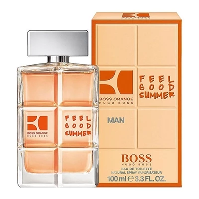 Boss Orange Feel Good Summer by Hugo Boss for Men 3.3oz Eau De Toilette Spray Green, fruity, citrus and fresh accords combine for a happy, pleasing fragrance. The scent opens with lemon, juniper and green apple notes for an invigorating zing before settling further into a heart of cool cucumber, green tea and green pear. Dry down reveals notes of patchouli, ambrox and moss for a masculine and woody base.