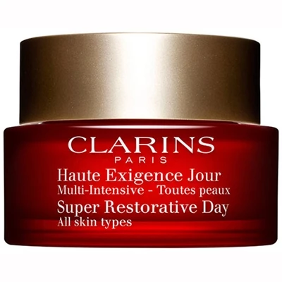 Clarins Super Restorative Day Cream for All Skin Types 1.7oz / 50ml. This works throughout the day to fight visible signs of aging caused by natural hormonal changes loss of density, skin slackening, deep wrinkles and age spots. This deepreplenishing formula, with organic Harungana Leaf, helps visibly restore skins density and healthylooking vitality. Deep wrinkles are noticeably diminished. Skin is plumped for an instant smoothing effect.