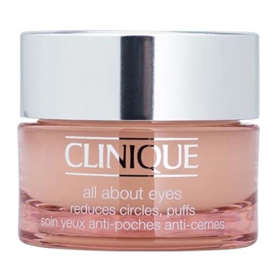 Clinique All About Eyes All Skin Types 0.5oz / 15ml Cliniques All About Eyes lightweight eye cream diminishes the appearance of puffs and undereye circles. This noncreep, cream/gel formula actually helps hold eye makeup in place.