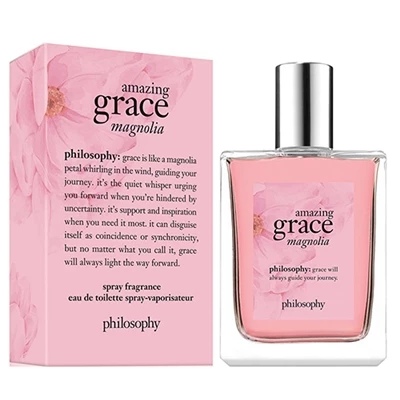 Philosophy Amazing Grace Magnolia for Women 2oz Eau De Toilette Spray Let grace be your guide. Harmonious, breezy, and subtly complex, Amazing Grace Magnolia brings a spirited new dimension to the beloved Grace family of fragrances. Notes of bergamot and nectarine accord mingle with sweet magnolia and violet. Warm musk, solar amber, and a wisp of driftwood add depth and complexity to this bright and beautiful new blend.